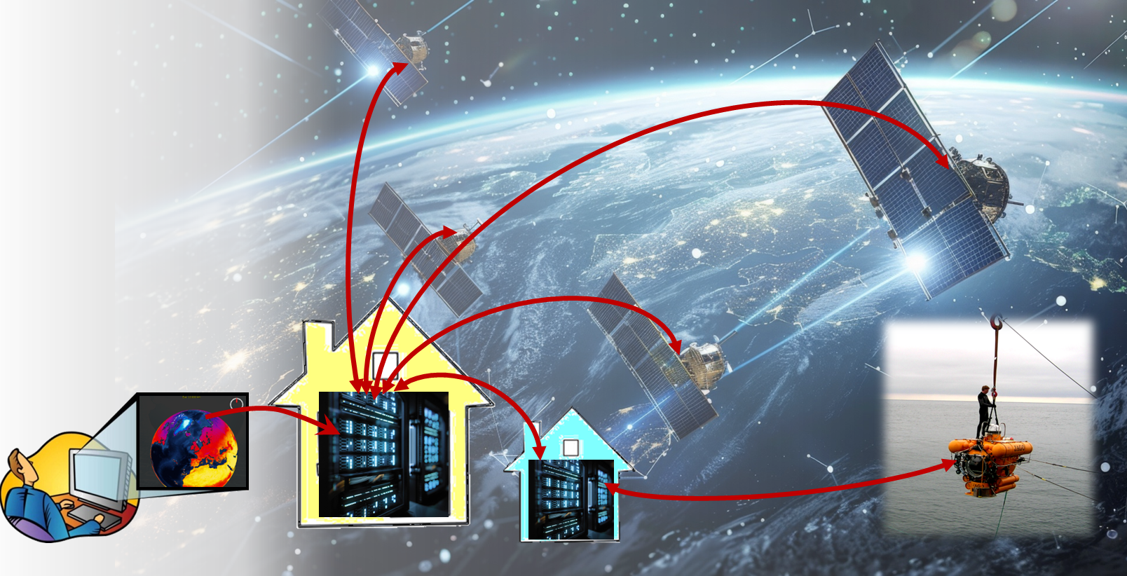 This setup is used for demonstrating federated cloud/edge datacube processing connecting the satellite
